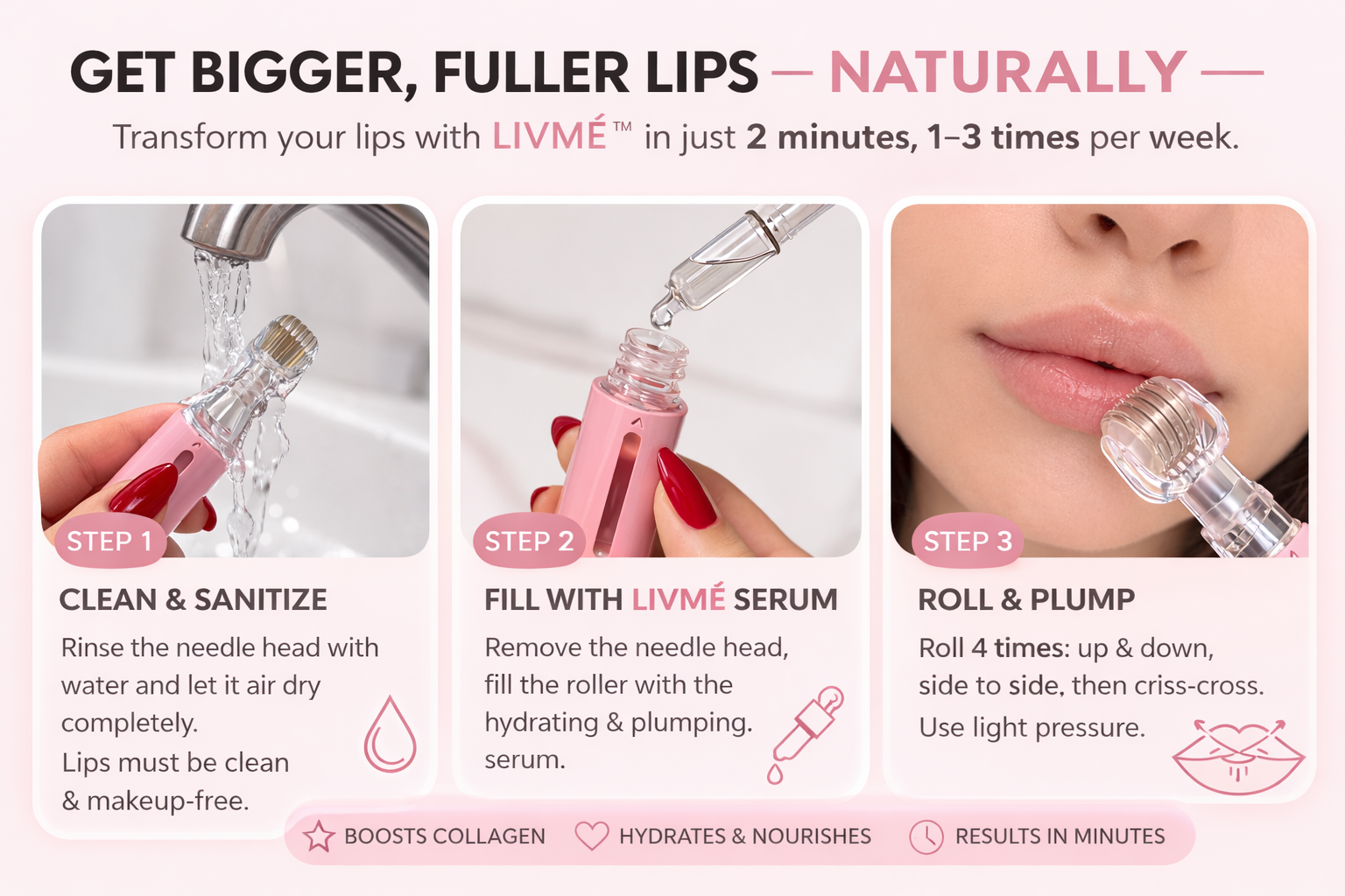 The LIVMÉ lip routine is designed to enhance the natural appearance of your lips through hydration and gentle stimulation.